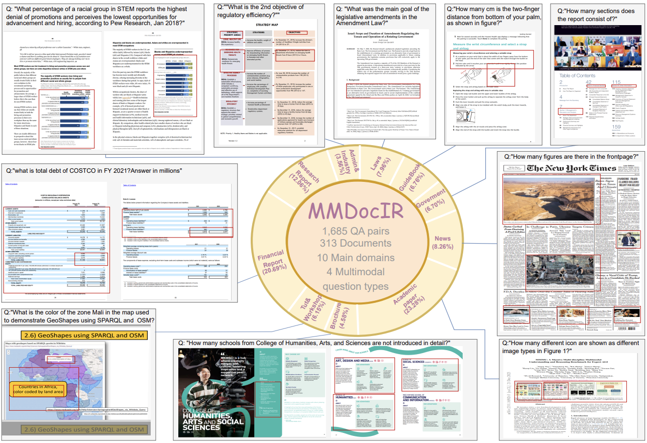 MMDocIR is a large-scale benchmark designed to advance research in multi-modal document retrieval. It comprises both an evaluation set and a training set, featuring extensive coverage of document types, content modalities, and task complexity. The evaluation set contains 313 long documents with an average length of 65.1 pages, spanning ten distinct domains such as research reports, tutorials, legal documents, and financial statements. These documents offer a rich diversity of modalities, with 60.4% text, 18.8% images, 16.7% tables, and 4.1% layout or meta content. A total of 1,658 expert-annotated questions are paired with 2,107 page-level and 2,638 layout-level labels. The questions require various modalities for reasoning: 44.7% involve text, 37.4% tables, 21.7% images, and 11.5% layout/meta elements. Notably, the dataset introduces significant challenges with 313 multi-page questions, 254 cross-modal cases, and 637 questions requiring reasoning over multiple layout elements.